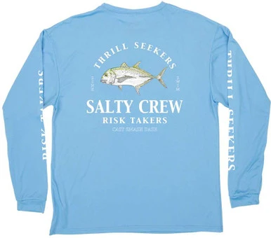 The Salty Crew GT Long Sleeve Rashguard is great for wearing as a rashguard or a fishing shirt. It features a Salty Crew GT screen printed design on the back with smaller version on the front and printed wording down the sleeves. This shirt made with UPF 40+ polyester material with Antimicrobial fabrication with moisture management.