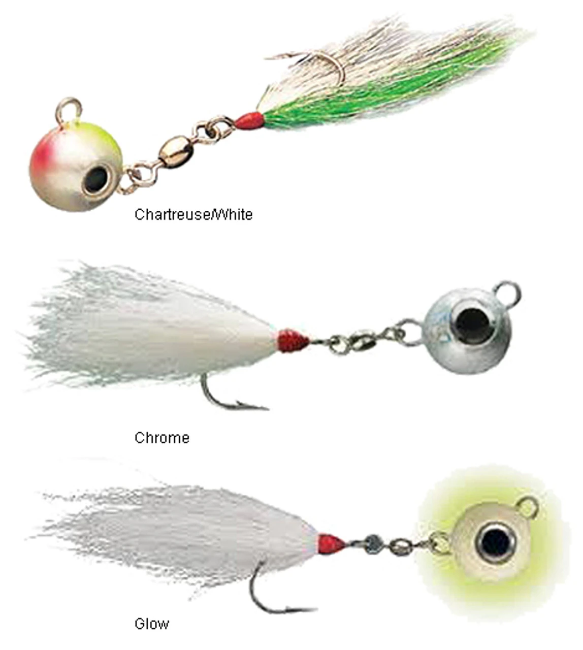 Great for a variety of species and exceptional for fluke! These ball jigs are very productive lures straight out of the package. Some anglers fish the jig solo and others like to rig it with a teaser (above) or a trailer (behind).